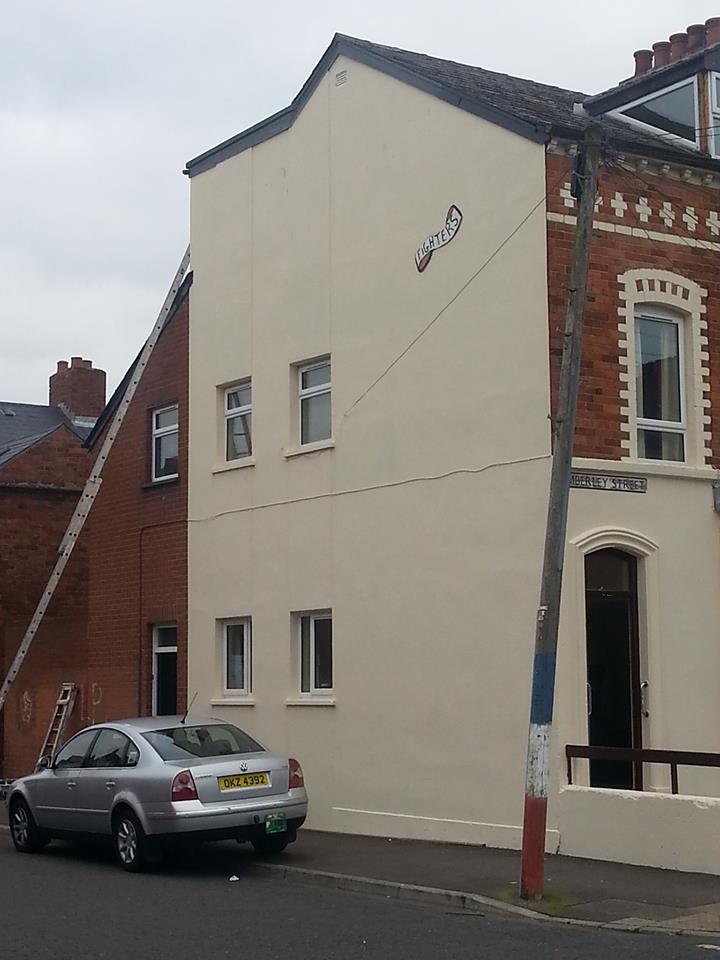 Any visitor unaware of the history of this particular corner would be forgiven for wondering why there is a fragment of wooden scrollwork on the gable wall with the word ‘Fighters’ on it; they wouldn’t know that it’s all that remains of the plaque of a red fist celebrating the Ormeau Road Freedom Fighters.